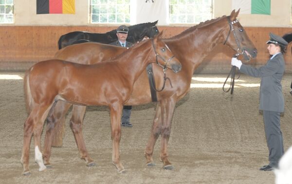 Steffen Bothendorf, Leiter des Hauptgestütes Graditz, ließ in einem Vortrag die Geschichte des Gestütsbetriebes in den letzten drei Jahrhunderten auf dem Weg vom Hofgestüt zum modernen Zucht- und Ausbildungsbetrieb Revue passieren. In den interessanten Ausführungen lernten die Zuhörer die Meilensteine der Gestütsgeschichte und Persönlichkeiten, wie z.B. Graf Georg v. Lehndorff, kennen. Mit Stolz konnte Steffen Bothendorf auch die fortlebende Tradition der ältesten Zuchtstätte für Vollblüter in Deutschland darstellen.Nach dem Festakt folgten weitere interessante Programmpunkte. Auf dem ehemaligen Speicher über dem Eingangsportal folgte die Eröffnung einer Ausstellung mit wertvollen Zeichnungen und Gemälden des renommierten Pferdemalers Klaus Philipp und zum Teil historischen Pferdefotografien der passionierten Fotografin Felicitas Tank. Selbstverständlich kamen auch die Graditzer Pferde nicht zu kurz. Eine Demonstration von Zuchtpferden in der Reithalle gab einen kleinen Überblick über die heutige Arbeit, Erfolge und Schwerpunkte des Gestütes. So wurden neben einer Kollektion von Fohlen des Hengstes SIR HAYFIELD auch die in Graditz gezogenen Landbeschäler LÖßNITZ und LA BOSTELLO unter dem Sattel vorgestellt. Die Präsentation von Vollblutstuten mit Fohlen des Gestütspächters Herrn Wirth und der Vollbluthengste Santiago xx, TIPSY´S PET xx und SAAMI xx zeigte die lebendige Tradition der ältesten Vollblut-Zuchtstätte in Deutschland. Neben den Reitpferden und Vollblütern wird auch die Zucht von Trakehnern in Graditz erfolgreich fortgeführt, was mit den vorgestellten Trakehnerstuten und der Präsentation des Trakehnerhengstes MILLENNIUM eindrucksvoll demonstriert werden konnte. Nicht nur die Reproduktion und die Bereitstellung von Zuchtpferden gehört zum modernen Gestütsbetrieb. Eine gerittene Abteilung von Graditzer Lehrlingen stand als Symbol für die Ausbildung des pferdewirtschaftlichen Nachwuchses.