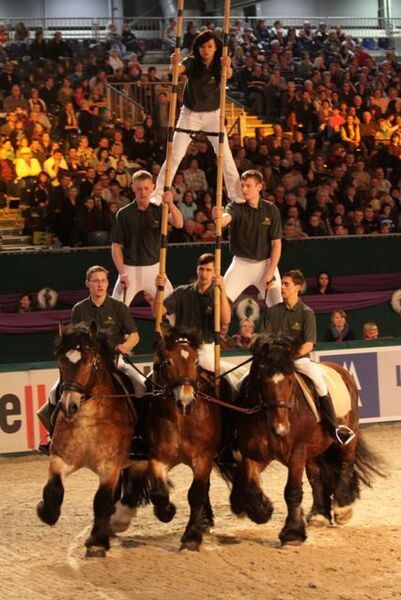 Im Schauprogramm der Messe Partner Pferd am Freitagabend zeigten die Lehrlinge der Landgestüte Prussendorf und Moritzburg je drei Kaltbluthengste mit denen das Schaubild „Kaltblutpyramiden“ gestaltet wurde. Dabei wagten die Moritzburger sogar die Vorstellung im Galopp, die bisher nur auf dem großen Hengstparadeplatz zur Vorstellung kam.