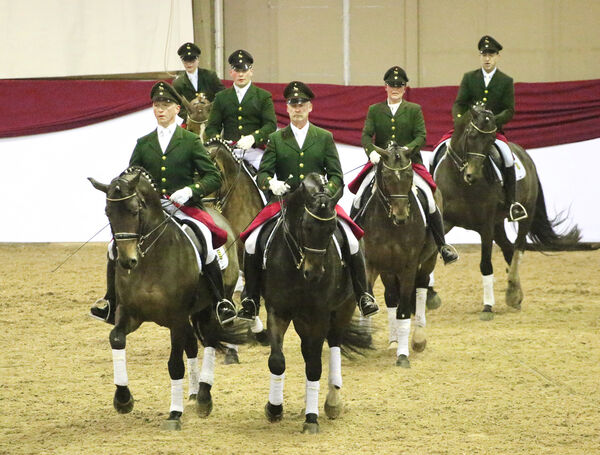 Neben der Präsentation der erfahrenen, bereits weit ausgebildeten Landbeschäler vor dem Wagen und unter dem Reiter sowie einem erstmalig durchgeführten Barrierespringen, wurde die Arbeit mit den Nachwuchspferden demonstriert. Sie kamen im Freispringen, an Longe und Doppellonge sowie bei ihren ersten Lektionen unter dem Sattel zur Vorstellung. Gut konnte der Zuschauer so den vertrauensvollen Umgang der Gestütsmitarbeiter mit den Junghengsten beobachten. Ebenfalls von Vertrauen zwischen Mensch und Tier zeugte die Freiheitsdressur mit Kaltbluthengst Balduin, der sich von GOW Gunter Paschke sogar vor voll besetzter Tribüne ablegen ließ.