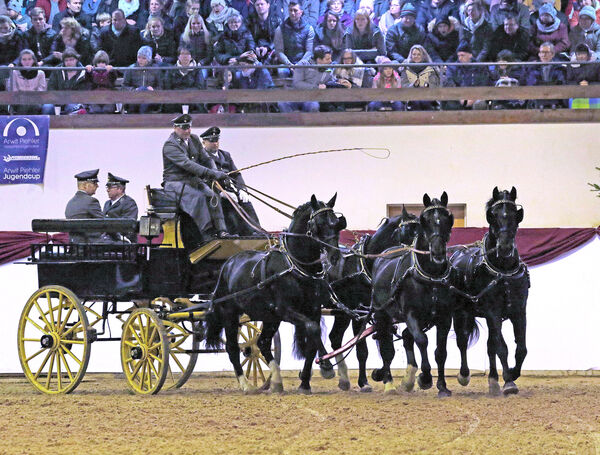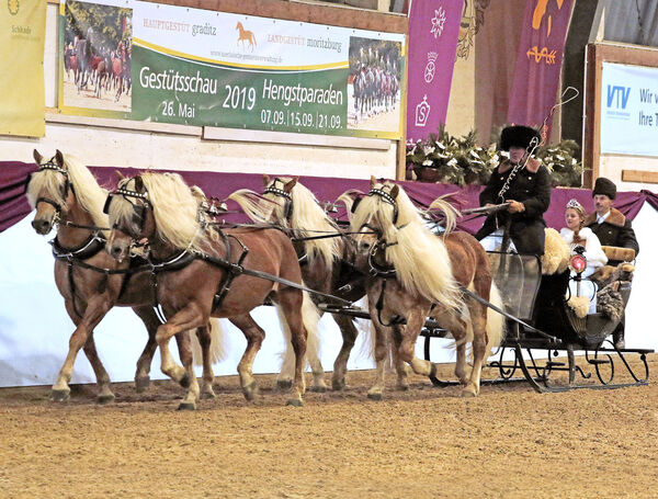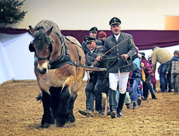Für richtiges Weihnachtsflair sorgte der von vier Haflingerhengsten gezogene und von Schellengeläut begleitete Schlitten, und auch das traditionelle Tauziehen – Kinder gegen Kaltblüter – machte „Hengste im Advent“ einmal mehr zum Erlebnis. Die eindrucksvolle Präsentation des Dressursextetts der Landbeschäler bildete den krönenden Abschluss des Programms und somit auch der gestütseigenen Veranstaltungen in diesem Jahr.