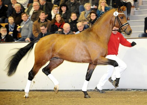 Von der NRW-Hauptkörung für Reitpferdehengste konnte mit der Katalognummer 5 ein Prämienhengst aus dem ersten Jahrgang des holländischen Rousseau-Sohnes Ampère über die Auktion erworben werden. Der typstarke braune KWPN-Hengst ist aus einer Jazz-Zeoliet-Ulft-Mutter gezogen. Die Mutter selbst ist als dressurveranlagte Stute in Holland in Erscheinung getreten und brachte vier Dressurpferde für den Sport. Auch aus der Großmutter und Urgroßmutter kamen erfolgreiche Dressurpferde. An allen drei Tagen der Körung gefiel der Hengst durch sein gutes Abfußen, die erhabenen raumgreifenden Bewegungen und das gute Gleichgewicht im Gang.