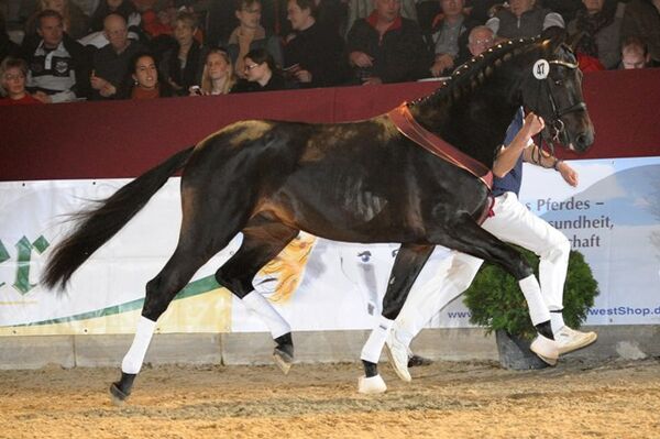 Die drei Landgestüte Moritzburg, Prussendorf und Neustadt/ Dosse erwarben in Besitzergemeinschaft den Siegerhengst der dressurveranlagten Körkandidaten der Hauptkörung in Neustadt/ Dosse am 17. November 2012. Vorausgegangen waren spektakuläre Auftritte dieses Hengstes, der den Namen QUATERSTERN erhielt. In seinem Pedigree vereinigt er die besten Protagonisten der berühmten Neustädter P-Familie. Vater ist der Bundeschampion Quaterback und Mutter die Sandro-Hit-Tochter Poetin III. Sie ist die Vollschwester der Bundeschampionesse und späteren Jungpferdeweltmeisterin Poetin. Im mittleren Rahmen stehend, konnte dieser dunkelbraune hochedle Bewegungskünstler die Herzen des Körpublikums erobern. Bei allen Auftritten erhielt er großen Applaus.