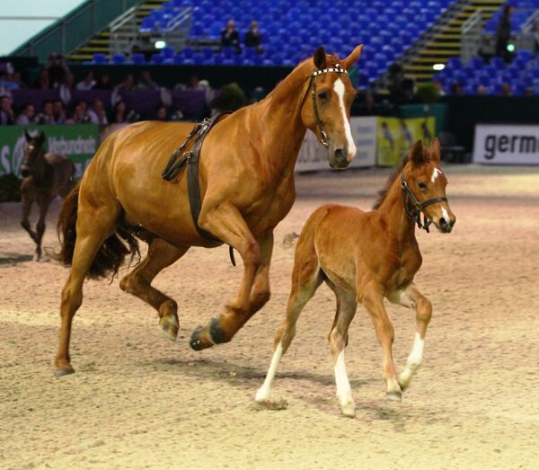 Im Schauprogramm am Donnerstagabend waren die Stuten des Hauptgestütes Graditz mit den ersten diesjährigen Fohlen freilaufend zu sehen. Darunter die süddeutsche Vizechampionesse der Reitpferde, die Stute Niobe v. Ra, die ein beeindruckendes Hengstfohlen von Ampère führte.