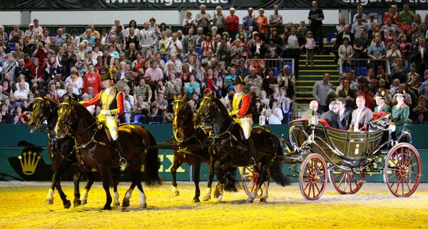 Ebenso kam ein Viererzug Schwerer Warmblutrapphengste (ELIXIER, ELLINGTON, ELEMENT und EHRENFRIED) an den Leinen von GOW Roland Lange vor eine Break gespannt zum Auftritt. Für die Siegerehrungen nach den Weltcupprüfungen in der Dressur am Sonnabend und im Springen am Sonntag wurde die Staatskalesche in der Galaanspannung à la d`Aumont zum Einsatz gebracht. Die Hengste CARTOON, EPIKUR, ERBPRINZ und LOUIS fuhren die Reiter Matthias Merten und Lutz Müller gekonnt vom Sattel aus.