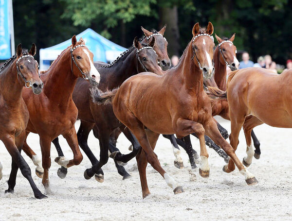 Die freilaufende Hauptgestütsherde mit den in den letzten Wochen geborenen Fohlen durfte als traditioneller und bei den Zuschauern beliebter Programmpunkt natürlich nicht fehlen. Darüber hinaus zeigten die Lehrlinge ihr Können in der Springquadrille und im Sattel der Fohlenstuten. Die Präsentation der 2018 im Hauptgestüt stationierten Landbeschäler wurde vor allem vom Fachpublikum mit großem Interesse verfolgt. Besonders beeindrucken konnte hier der erst dreijährige DSP-Prämienhengst EL SALVADOR, der den Hengstbestand der SGV seit dieser Saison bereichert.