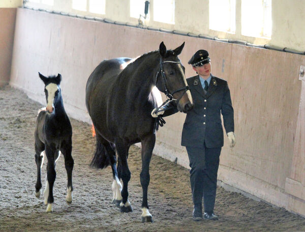Zum Abschluss konnten die Teilnehmer des Pferdetages noch einen Blick auf den ersten Nachwuchs des Hauptgestütes in diesem Jahr werfen: mit viel Dynamik und Ausstrahlung zeigten sich die beiden im Februar geborenen Hengstfohlen von BON VOYAGE a.d. Fine v. Ampere sowie von HICKSTEAD JUNIOR a.d. Overtüre v. Quantum mit ihren Mutterstuten in der Bahn.