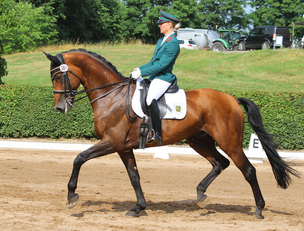 Erfolgreich präsentierten sich auch die Landbeschäler der SGV im Rahmen der Sächsischen Meisterschaft. Gleich zwei Siegerschleifen gab es für FÜRST WETTIN und Kay Pawlowska, die in der Dressurprüfung Kl. M** und im St. Georg Special* Höchstleistungen zeigten. Siegreich war auch der Trakehner Shootingstar FREIHERR VON STEIN, der unter demselben Reiter Platz 1 in der Dressurpferdeprüfung Kl. L erreichte. Zweifach Silber holte darüber hinaus Topvererber SANTO DOMINGO in der Dressurprüfung Kl. M* und in der Dressurprüfung Kl. L**.