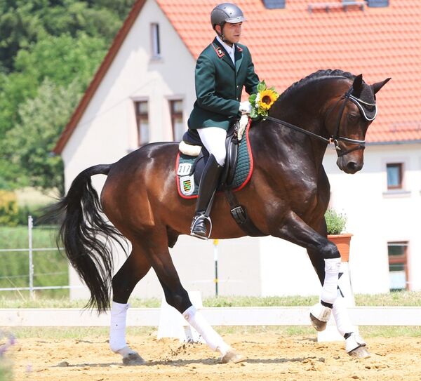 Am gestrigen Sonntag holte Kay Pawlowska mit ROSSINIMO v. Rosenstein zum Turnier in Burgstädt den Titel des Sächsisch-Thüringischen Champions der 5jährigen Dressurpferde.