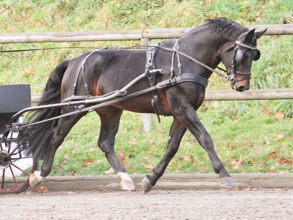Seifersdorf: Am Sonnabend fuhr der vierjährige SW-Hengst CADETT v. Celtis an den Leinen von Dirk Hofmann in der Eignungsprüfung für Fahrpferde souverän auf den 1. Platz. Das Paar erhielt die Note 7,83.