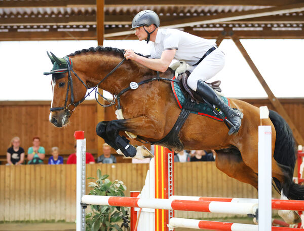 Ebenfalls mit André Stude im Sattel siegte der Oldenburger Prämienhengst CHADWICK v. Cascadello I überlegen in der Springprüfung Kl. M* mit Siegerrunde.